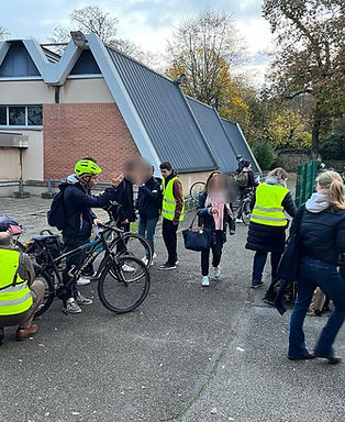 En novembre 2025, puis en février et avril 2026, à l’aube de matinées fraîches et encore sombres, plusieurs membres de l’APEL et du Bureau d’Initiative Lycéenne (BIL) se sont mobilisés devant le parking vélo de Notre-Dame du Grandchamp pour sensibiliser les élèves cyclistes à la sécurité à vélo.